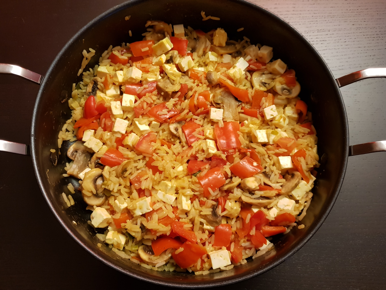 - Reis unterrühren und Gemüsepfanne mit Salz, Pfeffer und Curry abschmecken.