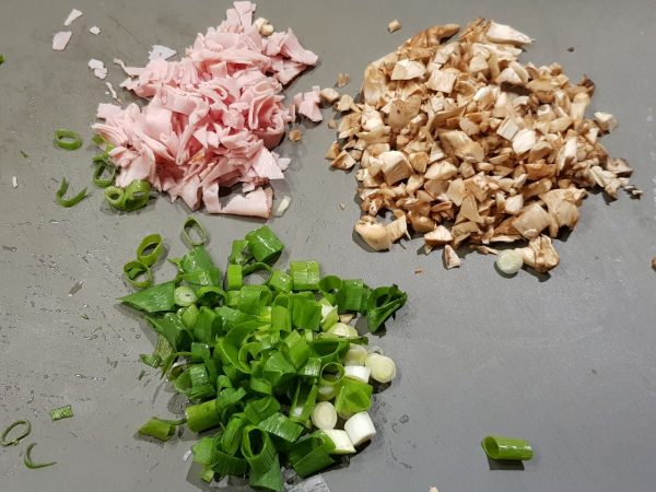 - Das Kleingehackte zusammenrühren und in Öl anbraten. Danach abkühlen lassen.