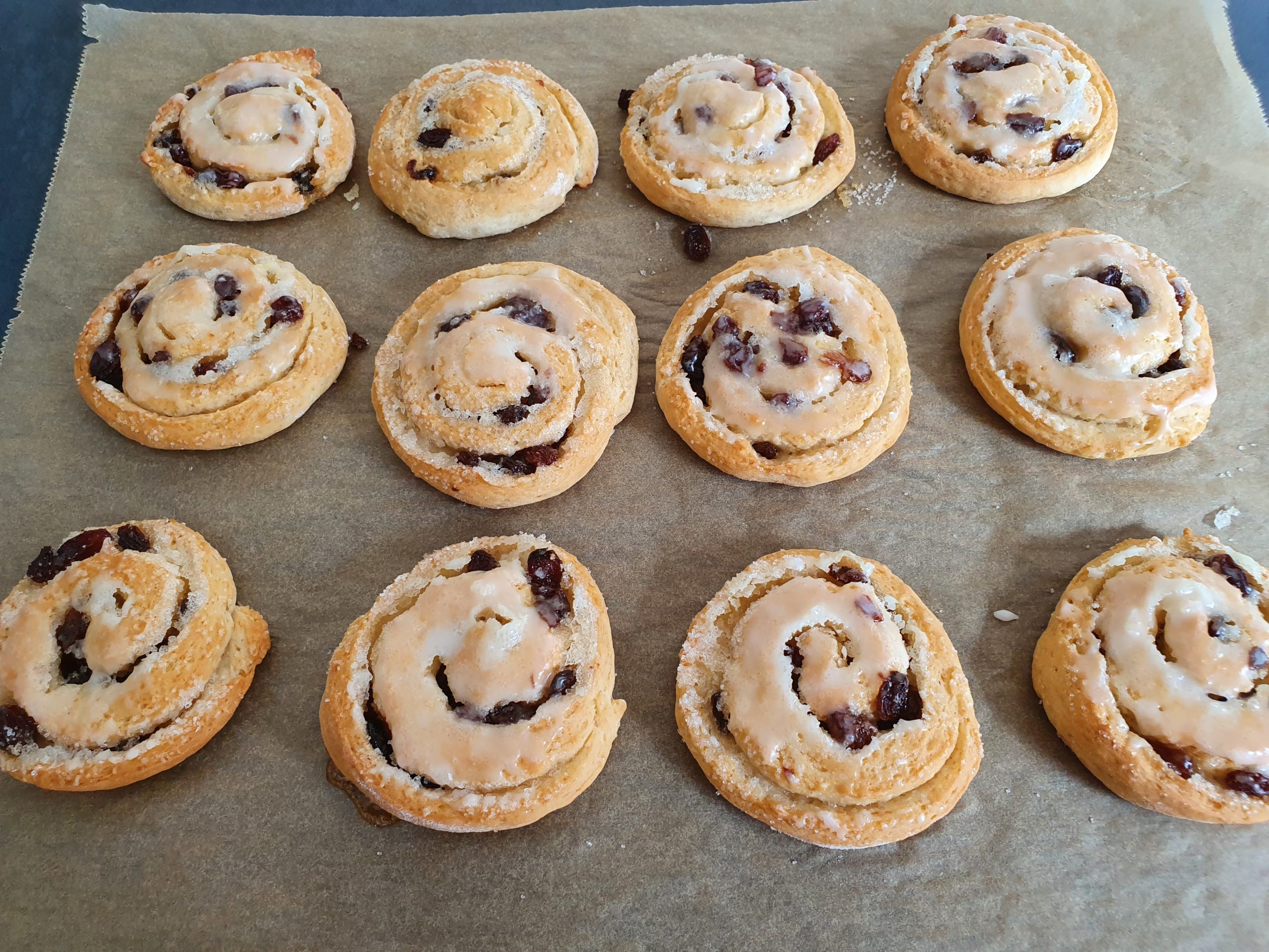 - Etwas Puderzucker in einer Tasse mit Zitronensaft verrühren und die noch warmen Schnecken damit bestreichen.
