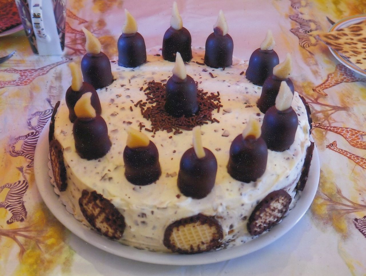 Als Geburstagskuchen aus kleinen Schokoküssen und Marzipan Kerzen basteln.